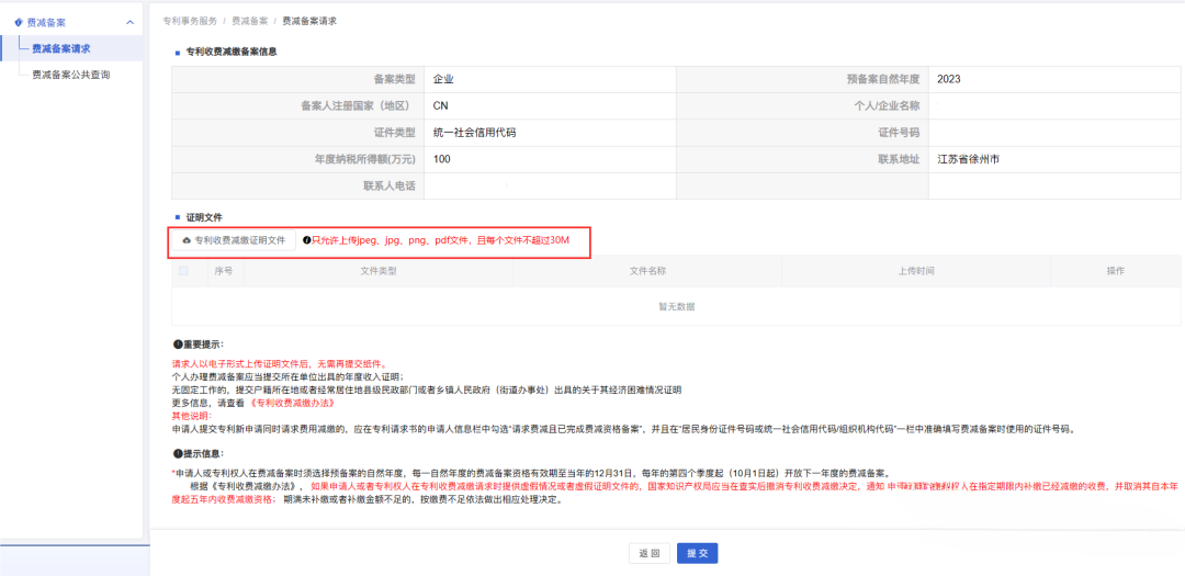 上传专利费减证明,企业上传营业执照复印件加盖公章、上年度纳税报表A类