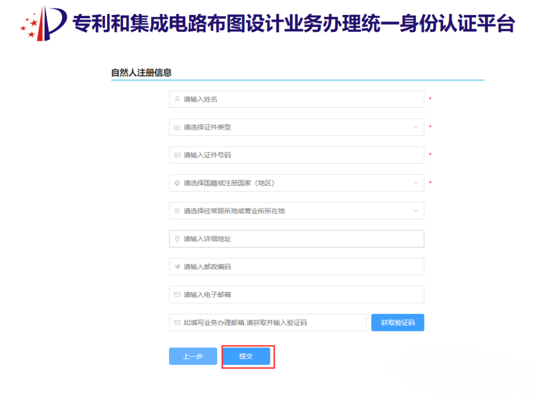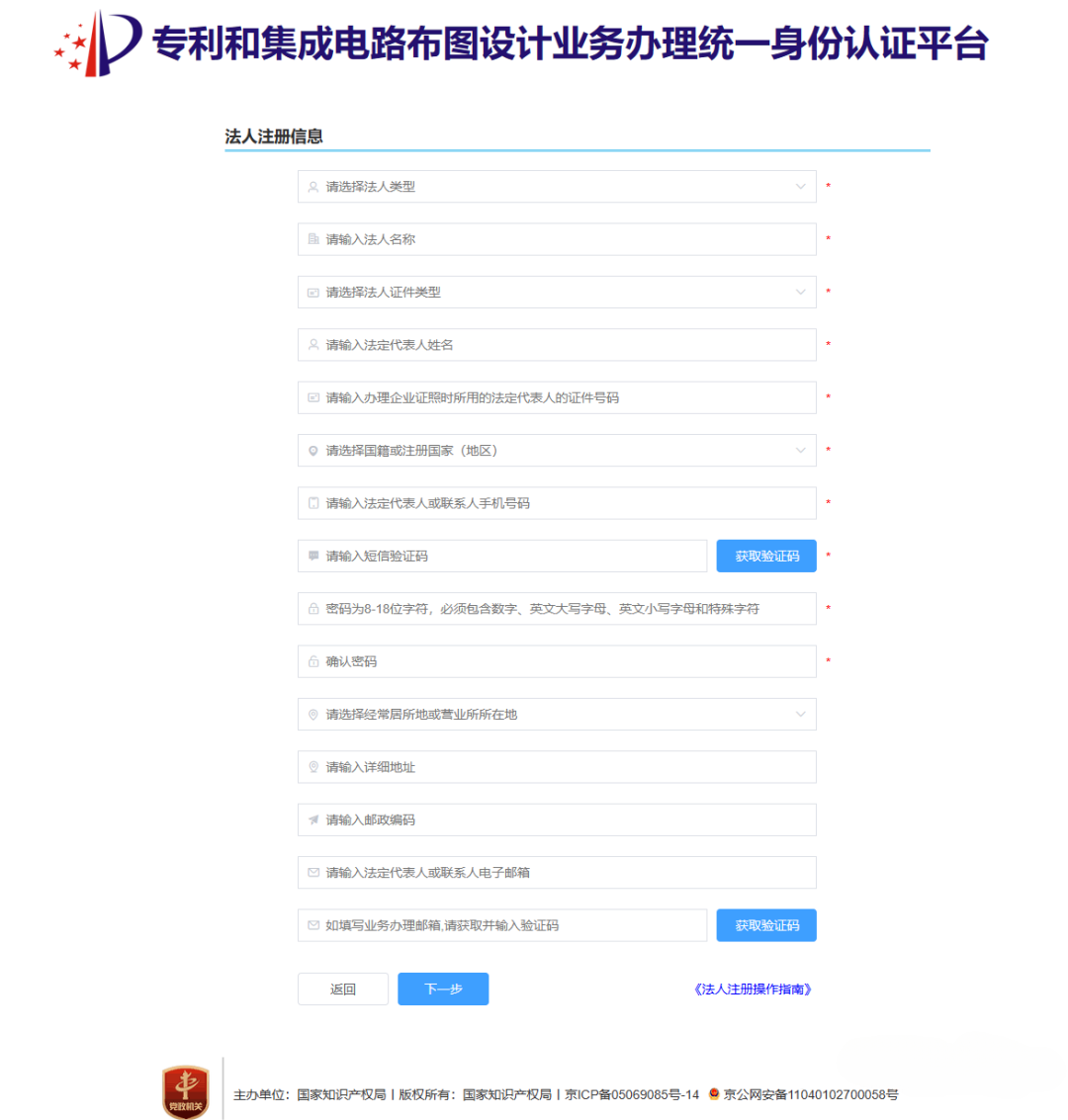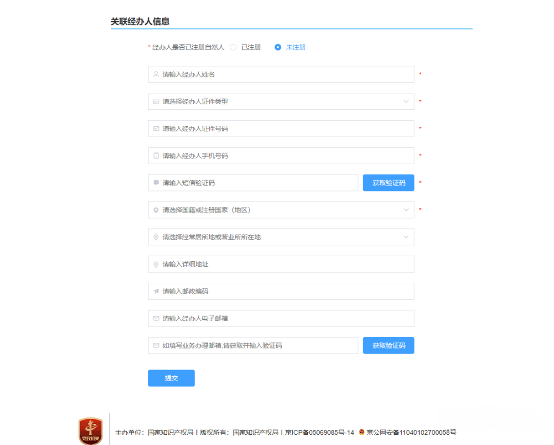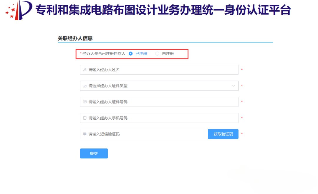 最上方经办人是否已注册自然人:如经办人有个人账号,选择已注册输入注册信息点击提交即可