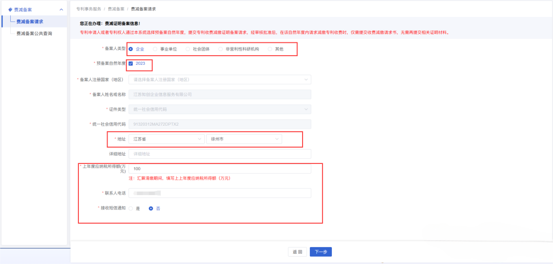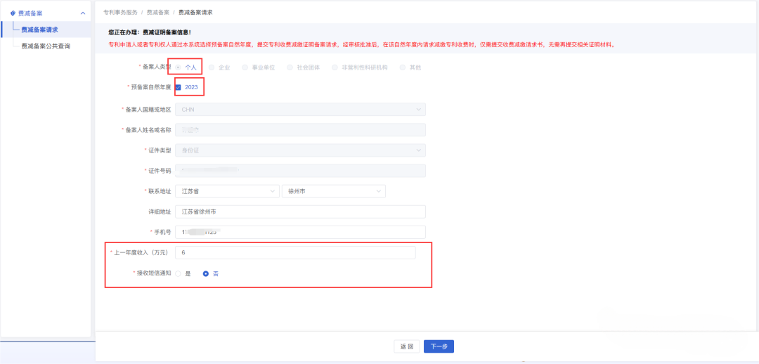 填写上年度收入(个人费减要求为上年度收入低于6万元),勾选对应的年份及是否接收短信通知,填好后点击下一步