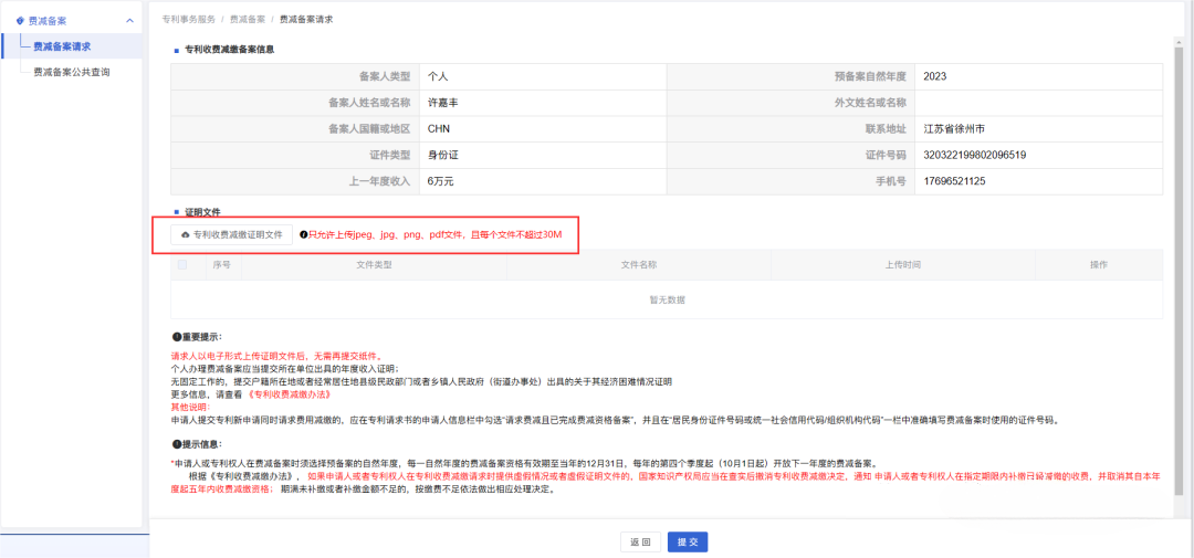 上传专利费减证明,个人上传身份证及上年度收入证明即可
