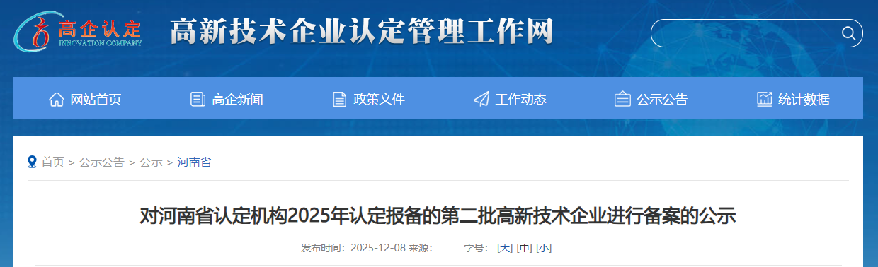 根据《高新技术企业认定管理办法》(国科发火〔2016〕32号)和《高新技术企业认定管理工作指引》(国科发火〔2016〕195号)有关规定,现将 河南省认定机构2025年认定报备的第二批929家高新技术企业(企业名单详见附件)进行备案公示,公示期为10个工作日。