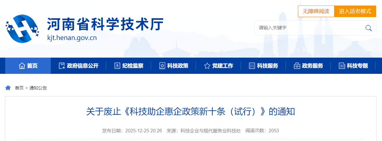 根据《河南省行政规范性文件管理办法》《河南省科学技术厅行政规范性文件管理实施细则》等相关规定,经研究,决定废止《科技助企惠企政策新十条(试行)》(豫科〔2024〕127号)。有关涉及科技助企惠企的政策以《河南省人民政府关于印发河南省支持企业科技创新若干政策措施的通知》(豫政〔2025〕16号)为准。