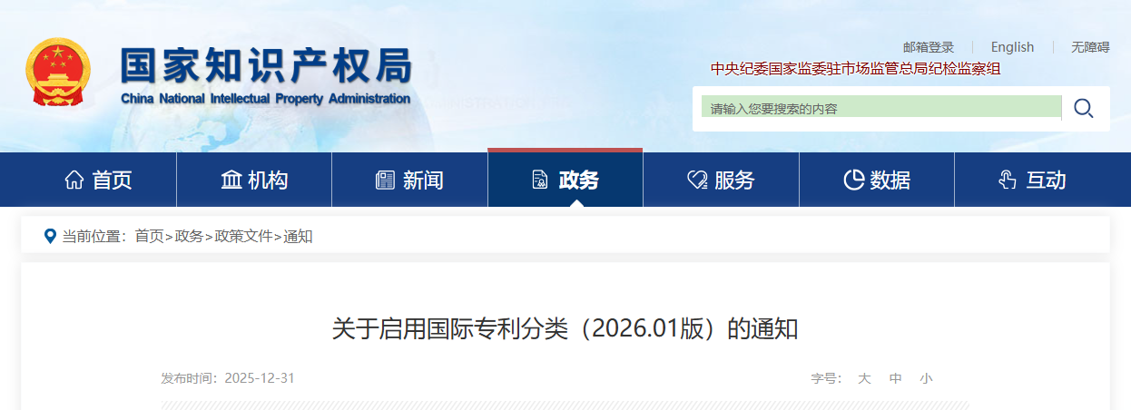 为确保中国专利文献国际专利分类号(IPC)的准确性和有效性,自2026年1月1日起,国家知识产权局启用IPC(2026.01版),对中国专利文献进行分类及公布公告。