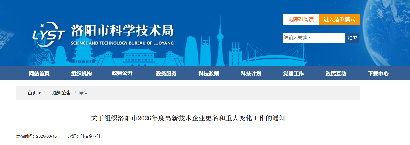 根据省高新技术企业认定管理领导小组办公室《关于组织2026年度高新技术企业更名和重大变化工作的通知》(豫高企办〔2026〕5号)(附件1)要求,为做好我市2026年度高新技术企业更名和重大变化工作,现将有关事项通知如下: