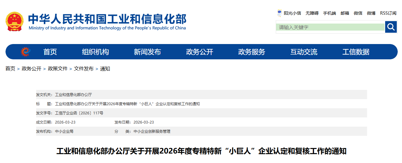 根据《优质中小企业梯度培育管理办法》(工信部企业〔2026〕2号,以下简称《办法》),现组织开展2026年专精特新“小巨人”企业认定和复核工作。有关事项通知如下: