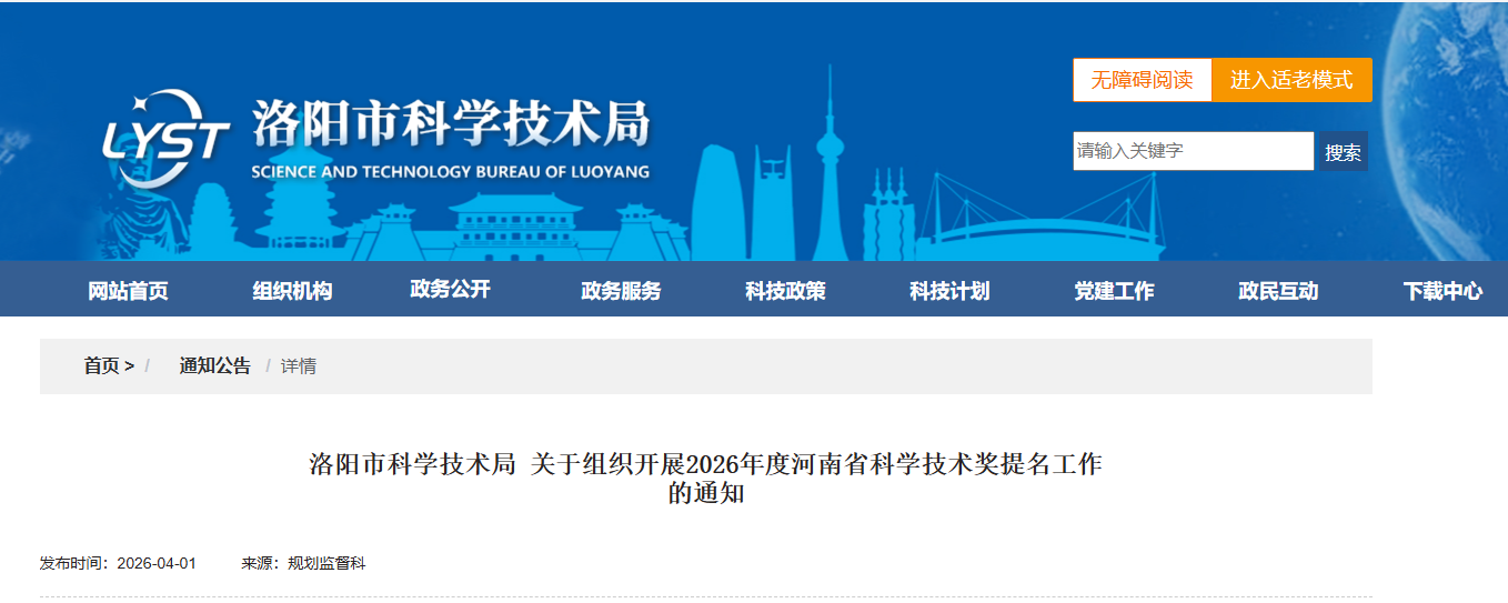 省科技厅3月31日下达《关于2026年度河南省科学技术奖提名工作的通知》(见附件1)。为切实做好我市省科学技术奖提名工作,现就有关事宜通知如下: