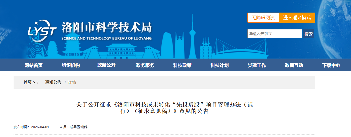 为创新科技成果转化财政支持方式,加快培育新兴和未来产业领域科技型中小企业,市科技局起草了《洛阳市科技成果转化“先投后股”项目管理办法(试行)(征求意见稿)》。现面向社会公开征求意见,有关事项公告如下: